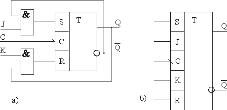 Рис. 3.17. Синтезируемая схема а) и графическое обозначение б) JK - триггера