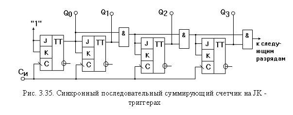 Синхронный последовательный счетчик. По способу подачи синхроимпульсов такие счетчики параллельные, т.е. синхроимпульсы поступают на все триггеры счетчика параллельно, а по способу управления (подачи управляющих импульсов) - последовательные. Схема синхронного последовательного счетчика, реализованного на JK-триг-герах, приведена на рис. 3.35.