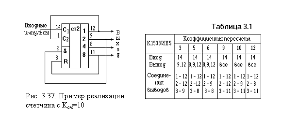 Как следует из рис. 3.37, роль ячейки, выявляющей факт достижения кодовой комбинации 1010 на выходах счетчика, играет ячейка И, уже имеющаяся на входе сброса ИМС К1533ИЕ5.
