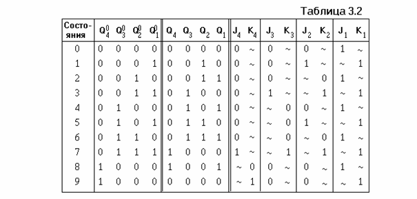 Рассмотрим пример синтеза синхронного двоично-десятичного счетчика на базе JK-триггеров. На рис. 3.38 показан граф, поясняющий последовательность переходов десятичного счетчика, в таблице 3.2 - таблица переходов.