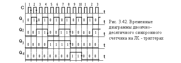 Из рис. 3.42 следует, что все изменения состояний триггеров происходят во время формирования заднего фронта положительного импульса синхронизации. На временных диаграммах выходов Q1 . . . Q4 присутствуют двоичные цифры, характеризующие текущее состояние счетчика.