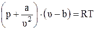 При высоком сжатии газа его параметры уже не будут описываться уравнением состояния идеального газа. Ван-дер-Ваальсом были введены в уравнение состояния идеального газа (2.27) поправки: величина b, учитывающая объем самих молекул, и величина a/v2, учитывающая взаимодействие между молекулами. В результате было получено уравнение состояния «реального газа» (уравнение Ван-дер-Ваальса) в следующем виде:
