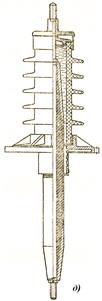 Для аппаратов на напряжение 35 кВ используются обычно бумажно-бакелитовыевводы (рис. 2.4д). Они изготовляются путем намотки на токоведущий стержень изоляционного тела из бумаги, смазанной бакелитовой смолой. Недостатком бумажно-бакелитовых изоляторов является малая влагостойкость, обусловленная их слоистым строением, и низкая стойкость к разрядам по поверхности. Поэтому такие изоляторы, предназначенные для наружной установки, помещают в фарфоровые покрышки, а пространство между покрышкой и бумажно-бакелитовым изоляционным телом заливают специальной мастикой