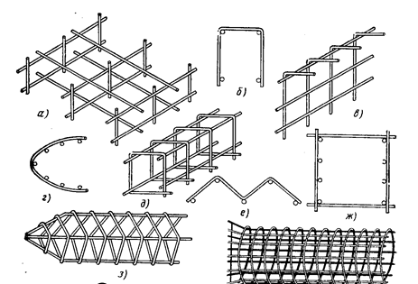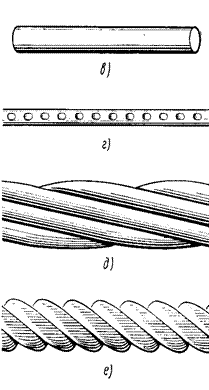 Рис. 2.1. Види арматурної сталі: а) – стержньова арматурна сталь періодичного профілю A-II; б) – те ж, класів A-III - A-V; в) – кругла сталь класів A-I, B-I, B-II; г) – дріт періодичного профілю класів Bp-I, Bp-II; д) – семидротяна сталка; е) – арматурний канат