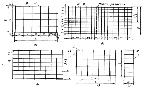 Рис. 2.2. Арматурні сітки: а – сітка з довжиною поперечних стержнів, що дорівнює ширині сітки, і однаковими кроками між поздовжніми і поперечними стержнями; б – те ж, з різним кроком; в – сітка ефективного армування з скороченими поперечними стержнями; г – сітка з скороченими поздовжніми стержнями; д – вузька двогілкова сітка (плоский каркас)