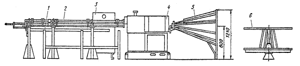 Рис. 2.6. Правильно-відрізний верстат СМЖ-357: 1 – збірник прутків; 2 – приймальне влаштування; 3 – електрообладнання; 4 – верстат; 5 – огорода з пристосуванням для заправлення прутків; 6 – розмотувальний пристрій.