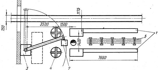 Рис. 2.7. Схема организации правки и резки арматурной стали на автоматических станках: 1 – автоматические правильно-отрезные станки; 2 – аппараты для стыковой сварки; 3 – консольный кран с тельфером; 4 – вертушки для проволоки в бухтах; 5 – стеллаж.