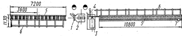 Рис. 2.9. Схема организации безотходной заготовки арматуры: 1 – откидной ролик; 2 – сварочная машина; 3 – станок для резки; 4 – сбрасыватель; 5 – роликовый стол; 6 – боковой стеллаж; 7 – упор.