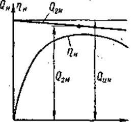 Действительная характеристика (Qдн)отклоняется от теоретической так, как это показано на рисунке. Указанное отклонение объясняется тем, что при повышении напора объемный кпд насоса уменьшается вследствие увеличения утечек.