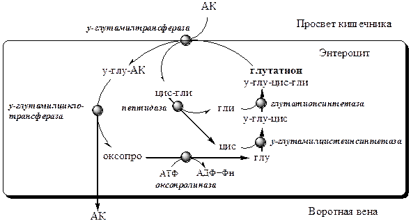 В этой системе участвуют 6 ферментов, один из которых находится в клеточной мембране, а остальные — в цитозоле. Мембранно-связанный фермент γ-глутамилтрансфераза (гликопротеин) катализирует перенос γ-глутамильной группы от глутатиона на транспортируемую аминокислоту и последующий перенос комплекса в клетку. Амнокислота отщепляется от у-глутамильного остатка под действием фермента у-глутамилциклотрансферазы.