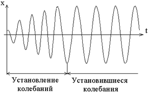 где b – коэффициент затухания , а w0 – собственная частота колебаний системы. Это неоднородное дифференциальное уравнение (с правой частью, не равной нулю). Из теории дифференциальных уравнений известно, что общее решение уравнения такого вида представляет собой сумму общего решения однородного уравнения затухающих колебаний, рассмотренного ранее, и частного решения данного неоднородного уравнения. При этом первое убывающее слагаемое играет роль только во время установления колебаний. На рис. 3 показан примерный вид зависимости x(t), описываемой уравнением (14).
