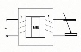 Если магнитный шунт (МШ) полностью введен в окно железного сердечника трансформатора, то магнитный поток Ф1, создаваемый током в первичной обмотке в стержне 1, шунтируется МШ. Магнитный поток Ф2 в стержне 2 будет минимальным, соответственно, будет Iкз min.