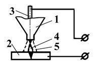 1 – сопло сварочной горелки; 2 – свариваемое изделие; 3 – электрод;