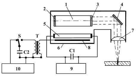1 - рабочее тело; 2, 3 - зеркала оптического резонатора; 4 - зеркало для поворота луча; 5 - лампа накачки; 6 - кожух эллиптического сечения; 7 - фокусирующее устройство; 8 - запускающий электрод; Т - импульсный трансформатор