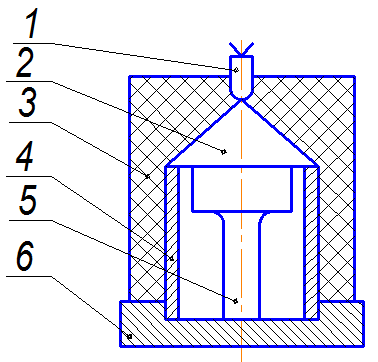 Рис.4.6. Сварка биметаллических цилиндрических заготовок переменного диаметра: 1-детонатор; 2-металлическийконус для направления детонационной волны; 3 – заряд ВВ; 4 – метаемая труба; 5 – облицовываемый цилиндр; 6 – центрирующее основание.