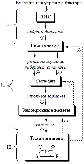 2. Второй уровень — эндокринная система. Включает гипоталамус, гипофиз, периферические эндокринные железы, а также отдельные клетки (АПУД система), синтезирующие под влиянием соответствующего стимула гормоны, которые через кровь действуют на ткани-мишени.