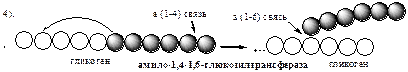 При удлинении линейного участка примерно до 11 глюкозных остатков, фермент ветвления переносит её концевой блок, содержащий 6—7 остатков, на внутренний остаток глюкозы этой или другой цепи с образованием α-1,6-гликозидной связи. Новая точка ветвления образуется на расстоянии не менее 4 остатков от любой уже существующей точки ветвления.