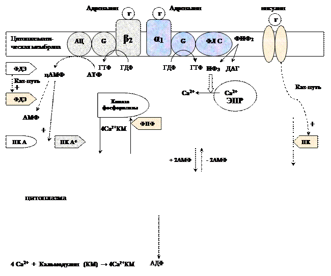 Метаболизм гликогена контролируется гормонами (в печени - инсулином, глюкагоном, адреналином; в мышцах - инсулином и адреналином), которые регулируют фосфорилирование /дефосфорилирование 2 ключевых ферментов гликогенсинтазы и гликогенфосфорилазы.