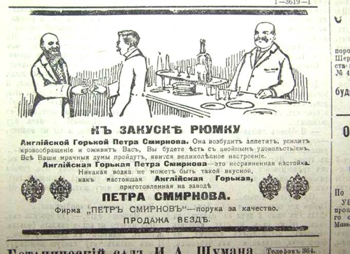 Однако Петр действовал более успешно: совсем бросовое «вино» он голословно назвал «народным» и дешево продавал его опустившемуся московскому люду. Так сомнительная слава о смирновской водке стала распространяться в низах, где ее покупали значительно чаще, чем более дорогие и высококачественные сорта других фирм.