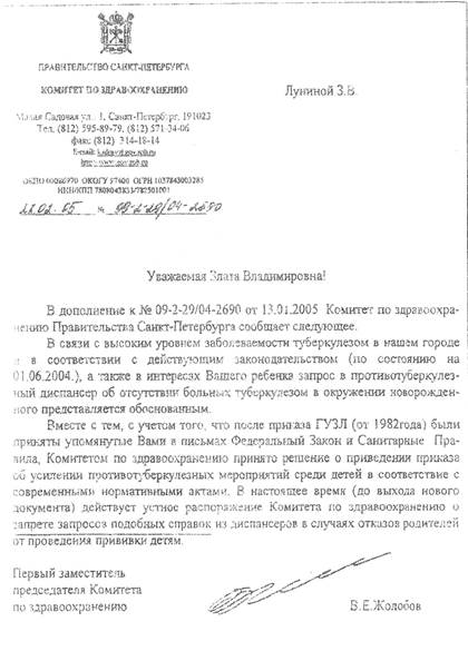Обратите внимание на прилагаемое письмо Комитета по здравоохранению Санкт-Петербурга, где говорится о запрете требования справок из тубдиспансеров в роддомах. (стр.23)