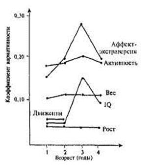 Диапазон изменчивости одной и той же функции (и статистике он измеряется коэффициентом вариативности, отклонениями от средней, дисперсией) может быть разным и разных возрастах, как мы видели на примере интеллекта и коммуникативных способностей. Рис L Коэффициенты вариативности для фи-На рис. 1 представлены зических, психологических и двигательных ха-данные о динамике ва- рактеристик [по 362]. риативности некоторых соматических и психологических показателей у детей в первые годы жизни. Обращают на себя внимание три факта: вариативность по психологическим признакам выше, чем по соматическим (роста и веса); вариативность по некоторым динамическим характеристикам поведения (активность, аффект-экстраверсия) выше, чем по оценкам интеллекта, и, наконец, в 3 года вариативность оценок интеллекта и аффекта-экстраверсии выше, чем в 2 и 4 года. Последнее особенно интересно: такой всплеск вариативности, т.е. расширение диапазона индивидуальных различий, может быть сигналом существенных психологических (и физиологических) перестроек, происходящих в данном возрасте*. Иначе говоря, сама межиндивидуальная вариативность может служить для психолога своеобразным маркером, указывающим на специфичность, значимость данного возраста для развития и формирования той или иной психологической или нейрофизиологической функции или черты (или их совокупности).