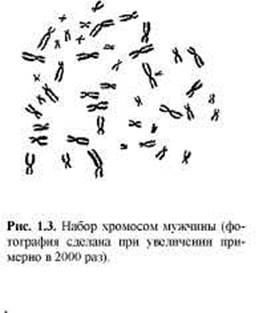 Хромосомный набор (число, размер, форма хромосом) человека называется его кариотипом. Обычно описание хромосомного набора проводится на определенных стадиях митоза. В это время их фиксируют, окрашивают, и тогда каждая хромосома становится отчетливо видимой. На рис. 1.3 изображена микрофотография хромосом человека (мужчины): их 46, или 23 пары, включая одну пару половых хромосом (Х- и Y-хромосомы).