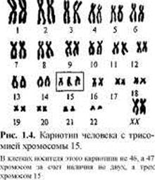При слиянии гаметы, содержащей «лишнюю» хромосому, с нормальной гаметой развивается организм, содержащий три копии одной хромосомы. Этот феномен известен под названием трисомия (подробнее о нем см. гл. II, IV). Рис. 1.4 воспроизводит микрофотографию кариотипа человека с трисомией хромосомы 15. При слиянии же нормальной гаметы с гаметой, потерявшей в мейозе одну из хромосом, развивается организм, содержащий только одну копию данной хромосомы. Это явление называется моносомией.