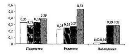 Примечание. У подростков оценка ими негативности родительских устанооок; у родителей — самооценка своих установок; наблюдения — экспертныеоценки видеозаписей,