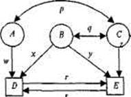 Связи между переменными обозначаются стрелками: постулированные исследователем причинно-следственные — направленной в одну сторону («путь» от причины к следствию); наблюдаемые ассоциации — двусторонней. На рис. 8.4 первые — w, x, у, z, r, s (путевые коэффициенты); вторые — р и q (коэффициенты корреляции). Иначе говоря, модель выделяет зависимые переменные (D и Е), подлежащие объяснению или прогнозированию, и независимые (А, В, С), действие которых должно объяснить или предсказать зависимые переменные и их связи. Есть и другие, более детальные, правила оформления и чтения путевых диаграмм, но мы их рассматривать не будем.