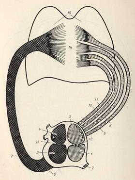 1 — левый желудочек; 2— аорта (гипопластична); 3— правый желудочек (резко увеличен); 4 — правое предсердие; 5 — левое предсердие (умеренно увеличено); 6 — артериальный конус (проступает); 7 — легочные артерии (с увеличенным диаметром); 8—11— легочные вены (с уменьшенным диаметром); 12 — двустворчатый клапан; 13—трехстворчатый клапан; 14 — второй легочный барьер; 15 — легкие.