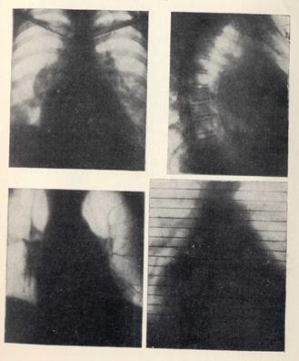 В прямой проекции типичная митральная конфигурация: увеличение сердца в обе стороны; фаза легочной гипертензии: корни расширены, особенно справа, в виде крупного узла. В первой косой проекции — оттеснение контрастированного пищевода по дуге большого радиуса. На томограмме видно аневризма-тическое расширение устья впадения правой верхней легочной вены, переходящее в расширенное левое предсердие (бесконтрастная кардиография). На рентгенокимограмме выявляется признак вентрикуляризации зубцов ушка левого предсердия.