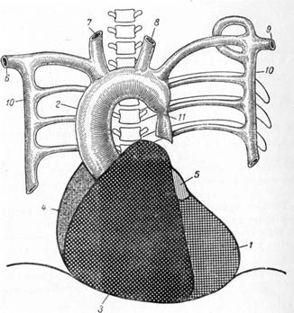 1 — левый желудочек (увеличен); 2 — аорта (расширена до места сужения); 3 — правый желудочек; 4 —правое предсердие; 5 — ушко левого предсердия; 6 — правая подключичная артерия; 7 — правая общая сонная артерия; 8 — левая общая сонная артерия; 9 — левая подключичная артерия; 10 — внутренняя грудная артерия; 11 — место сужения аорты.
