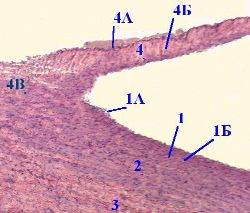 эндотелий (1.А) и подэндотелиальный слой (1.Б) с продольно расположенными гладкими миоцитами;