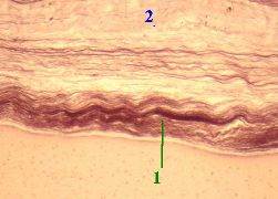 на предсердной стороне в этой ткани преобладают эластические волокна (1) (окрашены орсеином в тёмно-красный цвет),
