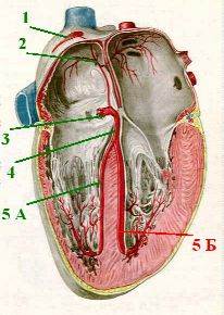 | Состав системы В проводящую систему входят два узла и отходящие от них пучки. 1. а) Синусный (или синусно-предсердный) узел (1) находится в верхней стенке правого предсердия. б) От него идёт пучок Кис-Фляка (2), связывающий предсердия друг с другом, а также со вторым узлом. 2. а) Атрио-вентрикулярный узел (3), или узел Ашоф-Тавара, располагается в нижней стенке правого предсердия, возле перегородки. б) От него в межжелудочковую перегородку отходит пучок Гиса (4), который затем делится на две ножки - правую (5.А) и левую (5.Б). Этот пучок связывает между собой желудочки. | Схема - проводящая система сердца.