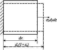 Рассмотрим вначале элементарный объем dV=dxdydz в условиях одноосного напряженного состояния (рис. 1). Мысленно закрепим площадку х=0 (рис. 3). На противоположную площадку действует сила
