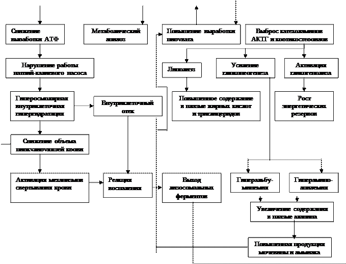 Существенный вклад в нарушение метаболизма вносят медиаторные системы (биологически активные вещества): гистамин, серотонин, кинины, простагландины, лизосомальные ферменты, комплемент, интерлейкины. При длительных и выраженных расстройствах микроциркуляции страдают так называемые «шоковые» органы – легкие, почки, печень, сердце, мозг, форменные элементы крови – эритроциты и тромбоциты. Преимущественное поражение того или иного шокового органа определяет дальнейшую картину шока. Так, поражение легких ведет к дыхательной недостаточности (нарушения вентиляции, диффузии, перфузии), почек – почечной недостаточности (анурии, олигурии, снижение экскреции креатинина, продуктов азотистого обмена, нарушению концентрационной функции почек и т. п.). Поражение печени сопровождается расстройством метаболической, дезинтоксикационной, гомеостатической и других функций этого важного органа.