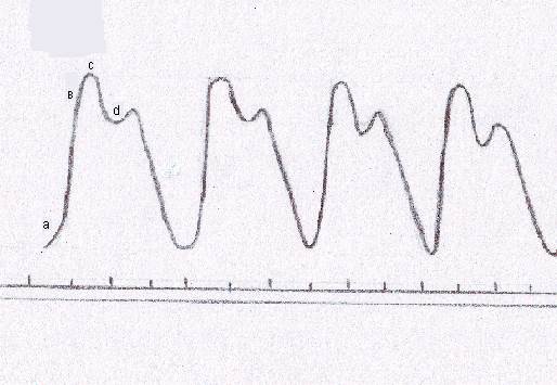 Проведение работы. Собирают установку из реографа и регистрирующего устройства (можно использовать электрокардиограф) заземляют ее, включают в сеть и производят необходимую настройку. У студента записывают реограмму верхней конечности. Для этого накладывают два электрода: один на внутреннюю поверхность кожи плеча, другой - на кожу предплечья. Между электродами и кожей помещают салфетки, смоченные в 10 % растворе NaCL . Запись реограммы проводят при скорости движения бумаги 25 мм / сек. На реограмме главная, или систолическая волна, отражает наполнение артерий и их ветвей. Она имеет крутое восходящее колено (а-в), заостренную вершину (с) и спуск, на котором имеется инцизура и дикротическая волна (d), которая обусловлена колебаниями кровенаполнения конечности во время диастолы.