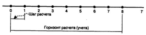 Горизонт учета измеряется числом шагов расчета, в качестве которых может быть месяц, квартал или год (например, горизонт учета 10 лет с разбивкой по годам — 10 шагов расчета; горизонт учета 3 года с разбивкой по кварталам — 12 шагов расчета). Шаг расчета — единица времени в расчетном периоде.