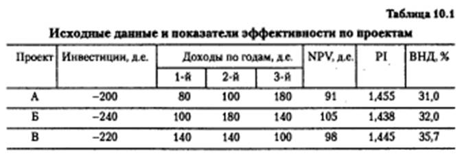 Предприятия, если имеется три независимых проекта А.Б,В (табл.10.1)