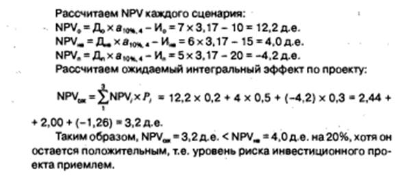 б) определение чистого дисконтированного дохода NPV по каждому сценарию;