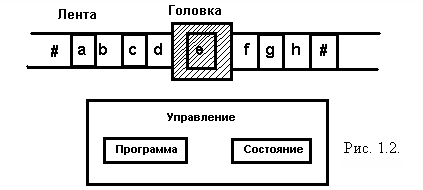 Правило функционирования поясним неформально на распространенной «физической» модели машины Тьюринга. Машина состоит из потенциально бесконечной (в обе стороны) ленты, управления и головки, перемещаемой вдоль ленты (см. рисунок 1.2.). Лента разбита на клетки, которые могут содержать символы из алфавита V или быть пустыми, т. е. содержать символ #. Управление на каждом шаге работы машины находится в одном из состояний из Q, расшифровывает программу, которая однозначно определяет поведение машины и управляет головкой.