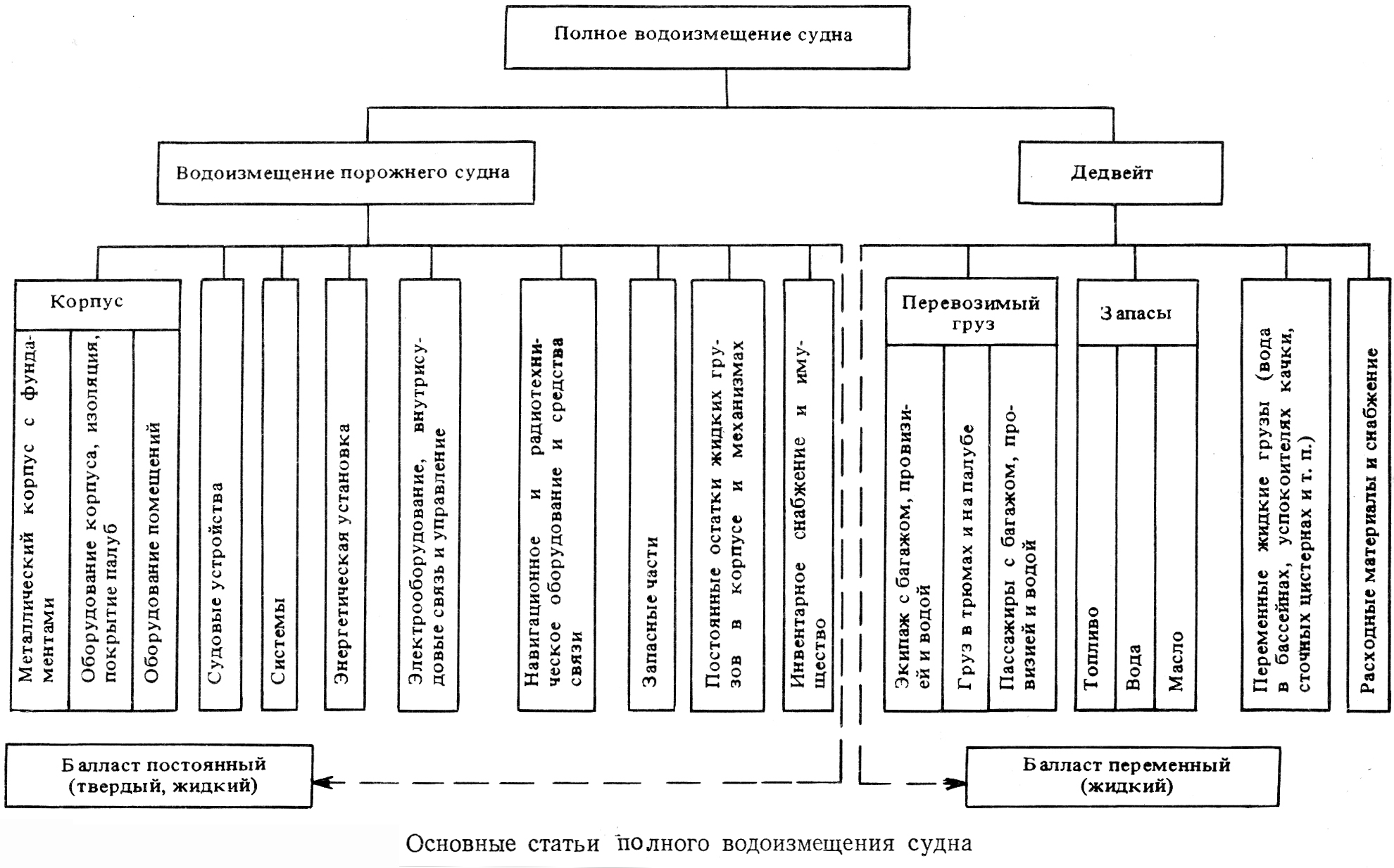 Весовые характеристики. Весовое водоизмещение судна равно весу вытесненной воды. В дальнейшем, чтобы исключить двоякое толкование, под водоизмещением судна мы будем понимать его полную массу Δ в тоннах.