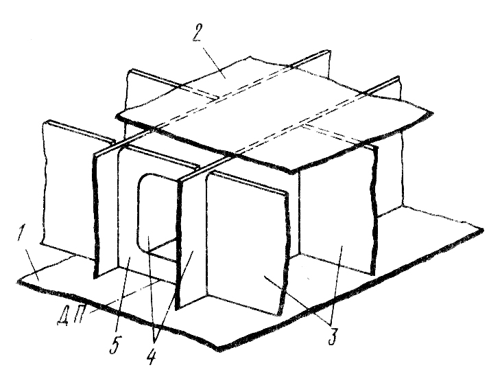1 — вертикальный киль; 2 — наружная обшивка; 3 — второе дно; 4 — подкрепляющие ребра жесткости; 5 — кольцевая обделочная полоса
