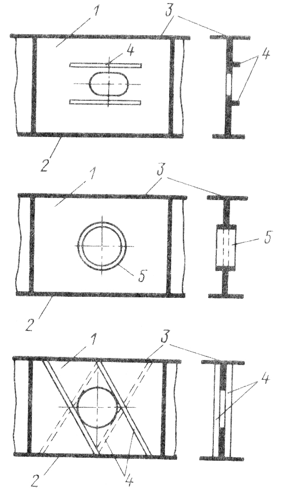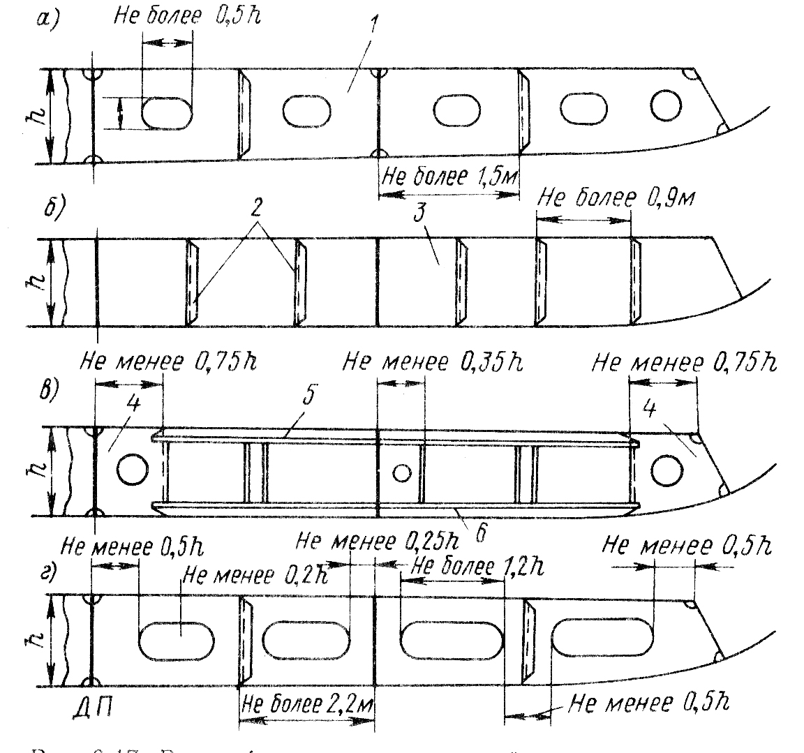 1 – сплошной флор; 2 – ребра жесткости; 3 – непроницаемый флор; 4 – бракета; 5 – верхняя балка; 6 – нижняя балка.