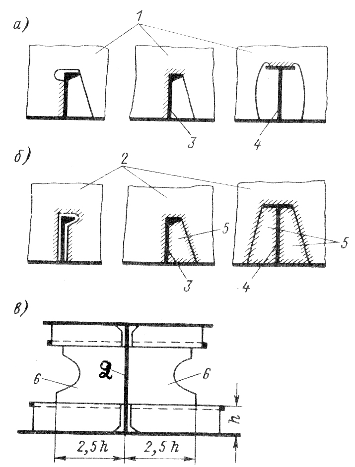 Виды флоров: а—сплошной проницаемый; б— сплошной непроницаемый; в — открытый бракетный; г — открытый облегченный.