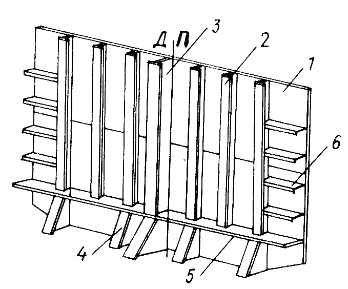 1 – полотнище; 2 – стойки; 3 – доковая стойка; 4 – кница; 5 – шельф; 6 – ребра жесткости