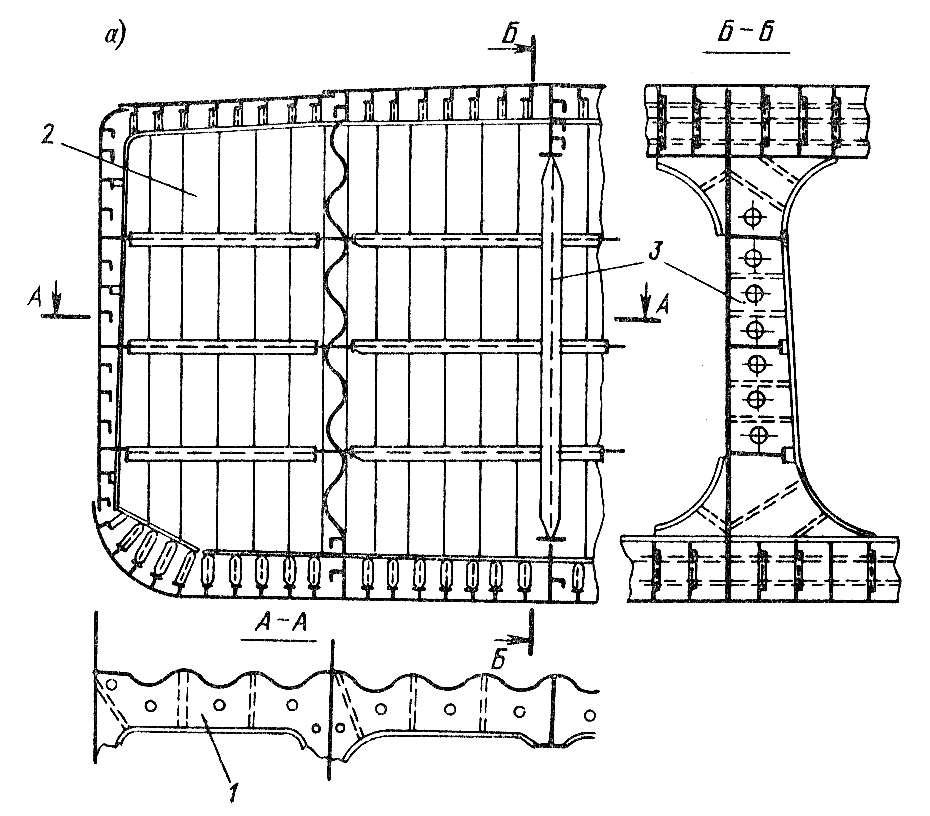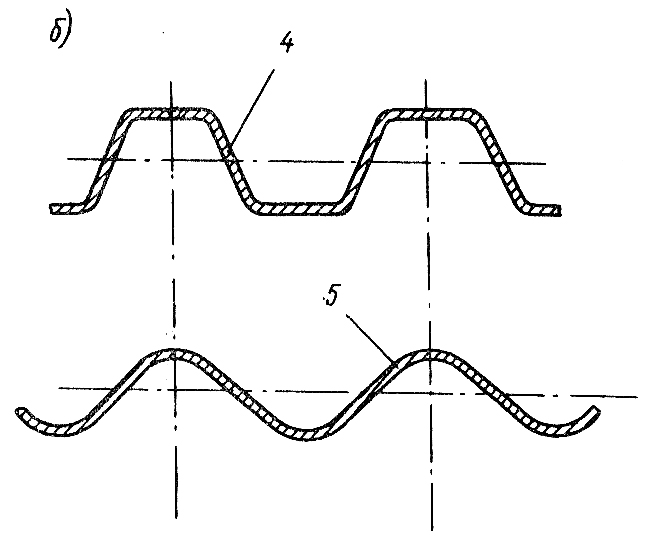 Гофрированная поперечная переборка: а – конструкция гофрированной переборки; б — типы гофров.