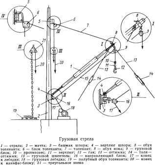 1 – башмак шпора; 2 – вертлюг шпора; 3 – мачта; 4 – обух топенанта; 5 — блок топенанта; 6 — топенант; 7 – обух нока; 8 – грузовой блок; 9 – противовес; 10 – вертлюг; 11 – гак; 12 – тали оттяжки; 13 – оттяжка; 14 – грузовой шкентель; 15 – стрела; 16 – направляющий блок; 17 – грузовая лебедка;18 – палубный обух топенанта; 19 — цепной стопор; 20 — лопарь топенанта; 21 — треугольное звено