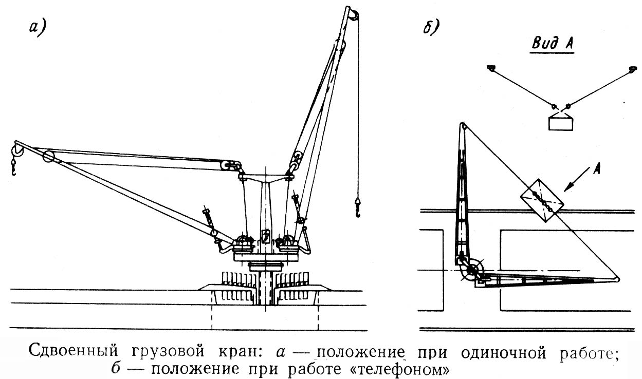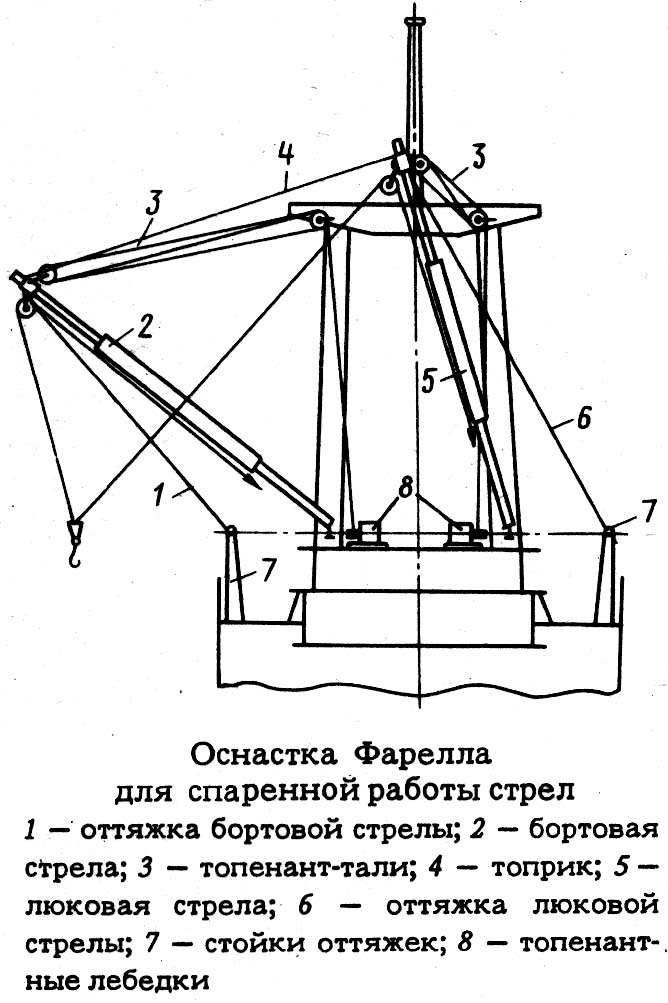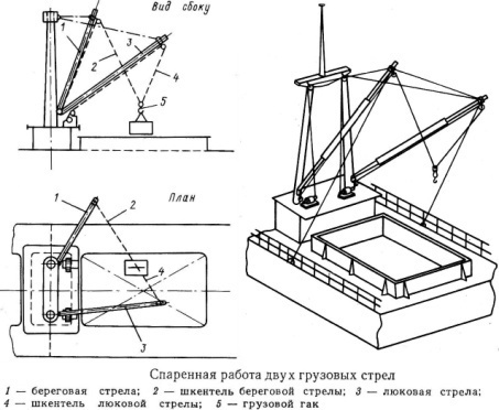 Легкие грузовые стрелы с оснасткой для одиночной работы имеют ограниченное применение в качестве вспомогательного грузового устройства. Причиной этого являются необходимость осуществлять поворот стрелы оттяжками вручную и большая продолжительность одного цикла работы стрелы, достигающая 4-5 мин. Поэтому на практике предпочитают спаренную работу двух стрел (способ „на телефон”). Грузовые шкентели двух стрел объединяют на общем трехзвеннике, к которому крепится и гак. Нок одной из стрел (люковой) устанавливается над люком, а другой (бортовой) выносится за борт. Стрелы раскрепляются неподвижно с помощью топенантов, оттяжек и топрика (топрик-талей). В этом случае перемещение груза происходит вследствие согласованного изменения длины шкентелей. Несмотря на некоторое снижение грузоподъемности при спаренной работе грузовых стрел, общая производительность возрастает в 3-4 раза, так как рабочий цикл длится около 35-40 с. Однако и при спаренной работе сохраняется присущий одиночным схемам недостаток – ограниченная возможность распределения груза. Этого недостатка лишены патентованные грузовые стрелы системы Фарелла, Велле и Мо-Слевинг.